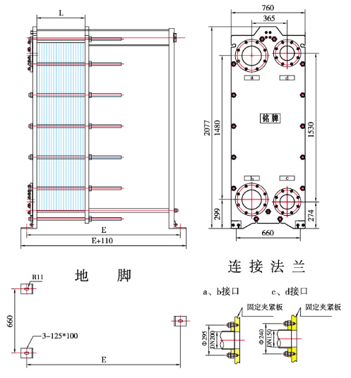 框架包括一个固定压紧板和一个活动压紧板,由上导杆与下导杆支承,在另‘端有一支柱。压制成的波纹板片悬挂在两板之间的上导杆上,移动活动压紧板将板片组压紧,再用一组夹紧螺柱将固定压紧板和活动压紧板夹紧至一定尺寸。两种介质经固定(或活动)压紧板上法兰孔流入由波纹板片组成的各自通道,热交换后介质再由固定(或活动)压紧板上的法兰孔流出。同定压紧板、活动压紧板、支柱及导杆均为低碳钢。考虑到用户的多种使用要求,框架设计有多种型式,主要有双支撑框架式和常用的落地式等,也可根据用户的要求更改框架的型式。